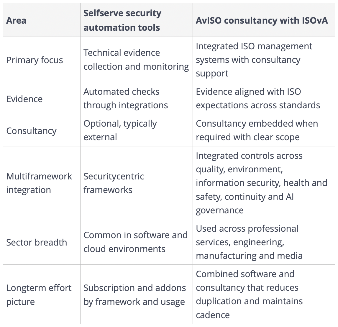 Self-serve security automation tools have helped many organisations reach initial security certifications by automating evidence collection and monitoring. As requirements broaden and teams seek integrated management across multiple ISO standards, some organisations prefer a more supported model. They want help designing processes, running internal audits, embedding change and maintaining cadence across the year.